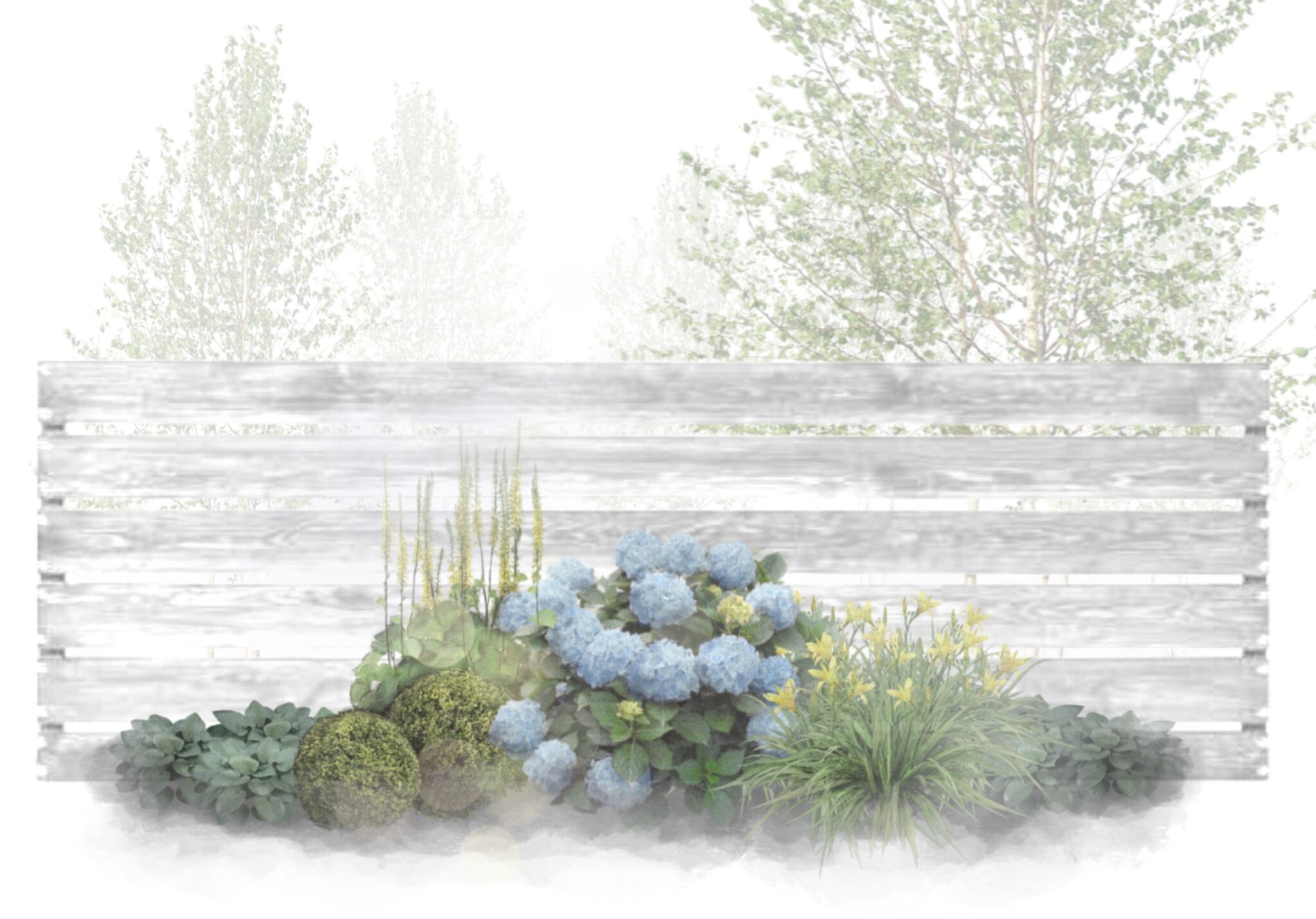 Wszelkie elementy umieszczone dodatkowo w wizualizacji projektu poza roślinami np. wyściółka, kruszywo, ławka, fontanna, taras itp. stanowią jedynie moją propozycję w jaki sposób i czym można dopełnić / zaaranżować projektowaną zieleń. Projekt oraz dane techniczne dotyczące ww. elementów (np. ławki uwzględnionej na wizualizacji) nie wchodzą w skład gotowego projektu zieleni.